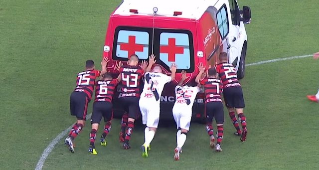 Era repriza a 2-a din partida de fotbal dintre Flamengo si Vasco da Gama. Jucatorul Bruno Silva de la Vasco da Gama se accidenteaza serios si salvarea intra pe teren. Omul este pus pe targa, suit in salvare, dar masina refuza sa porneasca. In fluieraturilor a 54.000 de suporteri, soferul le spune jucatorilor sa impinga masina ca sa porneasca din nou. Jucatorii ambelor echipe au pus umarul ca sa iasa din situatia asta comica.